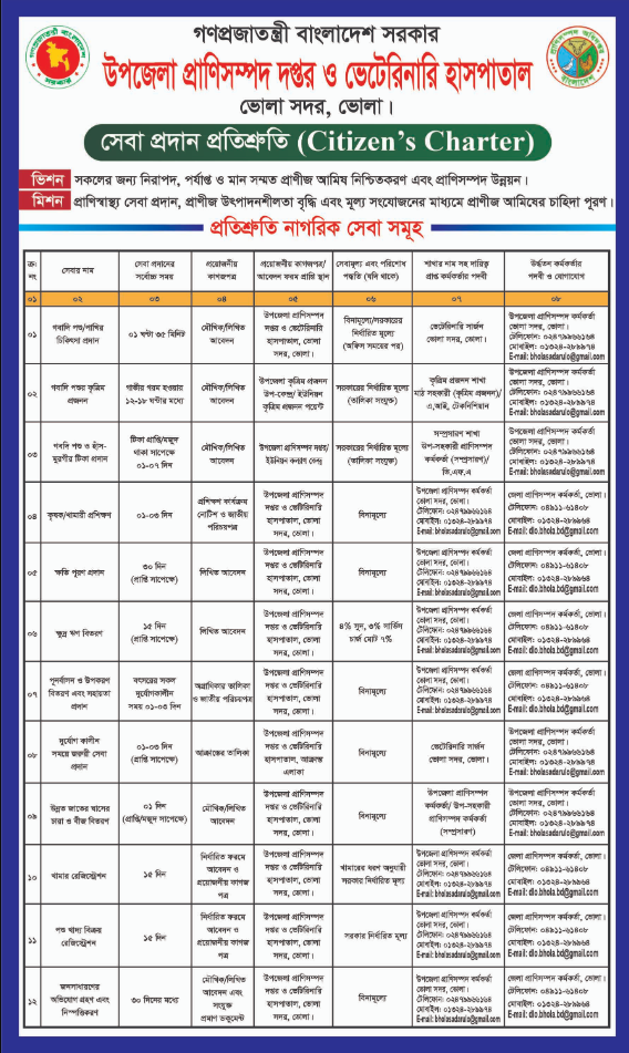 | ০১ | অসুস্থ গবাদি প্রাণি ও হাঁস-মুরগীর চিকিৎসা ও ব্যবস্থাপত্র প্রদান। (ক) হাসপাতালে, (খ) কৃষকের বাড়ী/খামার/চেম্বার (গ) গবাদি প্রাণি ও হাঁস-মুরগীর নমুনা (গোবর, রক্ত নমুনা পরীক্ষা ও প্রয়োজন বোধে আঞ্চলিক রোগ অনুসন্ধান গবেষনাগারে প্রেরন)। | ভেটেরিনারি সার্জন | সকাল ৯.০০ ঘটিকা হতে বিকাল ৫.০০ ঘটিকা | (প্রয়োজনে অফিস সময়ের পরে) বিনামূল্যে- নির্ধারিত ফি প্রদান স্বাপেক্ষে- বিনামূল্যে |